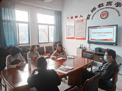 2022年10月28日下午,在惟行楼5208,教师教育学院党委组织学院全体民主党派老师召开座谈会,会议由党委书记刘娟娟主持。民主党派蔡艳梅、宋长胜、李春榆、李琳参加了座谈会。会上各位民主党派教师就二十大报告中关于教育高质量发展的论述学习,结合如何推进学院高质量发展进行了讨论并交流发言,为学院的发展提出了意见和建议,为下一步统筹优化、高质量推进学院发展提供了思路。