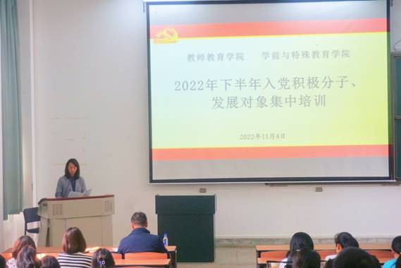 2022年11月4日下午,在博雅楼2103教室,教师教育学院、学前与特殊教育学院联合举办了2022年入党积极分子、发展对象集中培训开班仪式。教师教育学院党委书记刘娟娟、学前与特殊教育学院党委书记张大卫,两个学院的组织员、学生党支部书记、在校学生党员、72名参训对象共计100余人参加了培训,会议由教师教育学院组织员王艳芳主持。