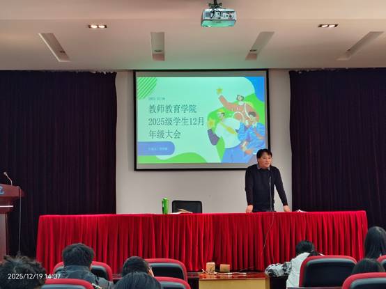 2025年12月19日下午,教师教育学院以“防范电信网络诈骗”为主题,在惟行楼4301报告厅召开2025级学生年级大会。学院党委副书记鲁寿坤、年级辅导员侍华丽和2025级学生参加了本次大会。